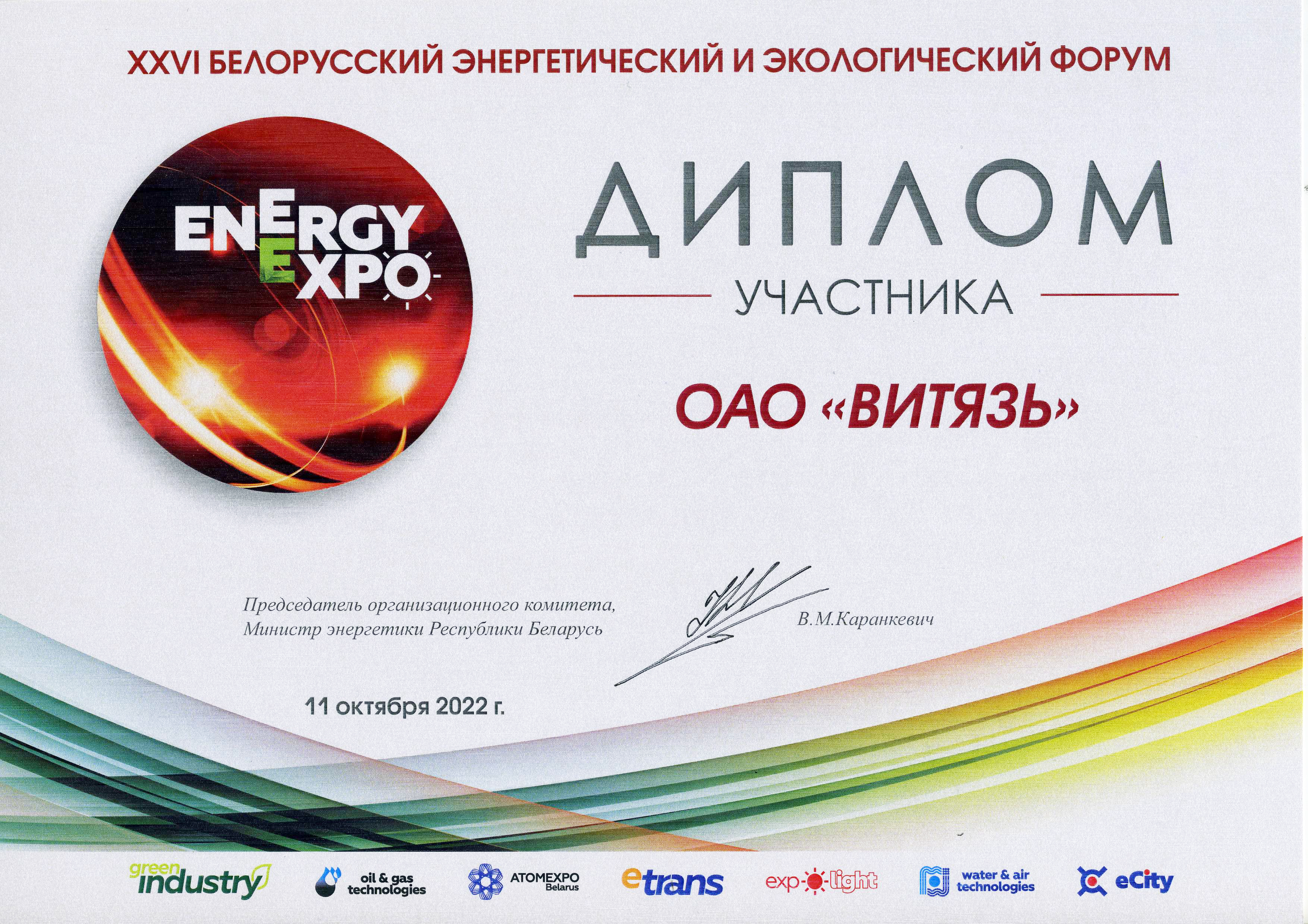 Диплом участника в Белорусском энергетическом и экологическом форуме