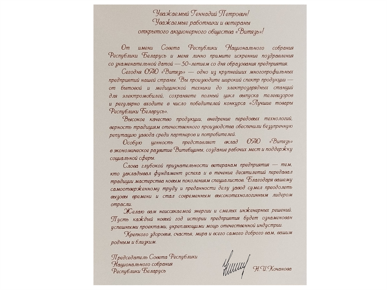 Поздравление Председателя Совета Республики Национального собрания Республики Беларусь